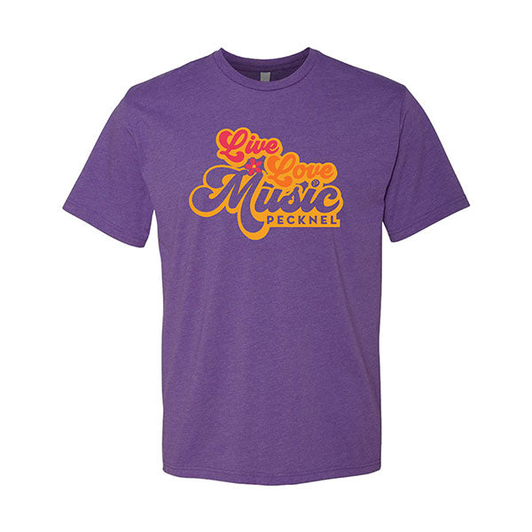 Spread the love of music with our purple "Live, Love, Music" tee.