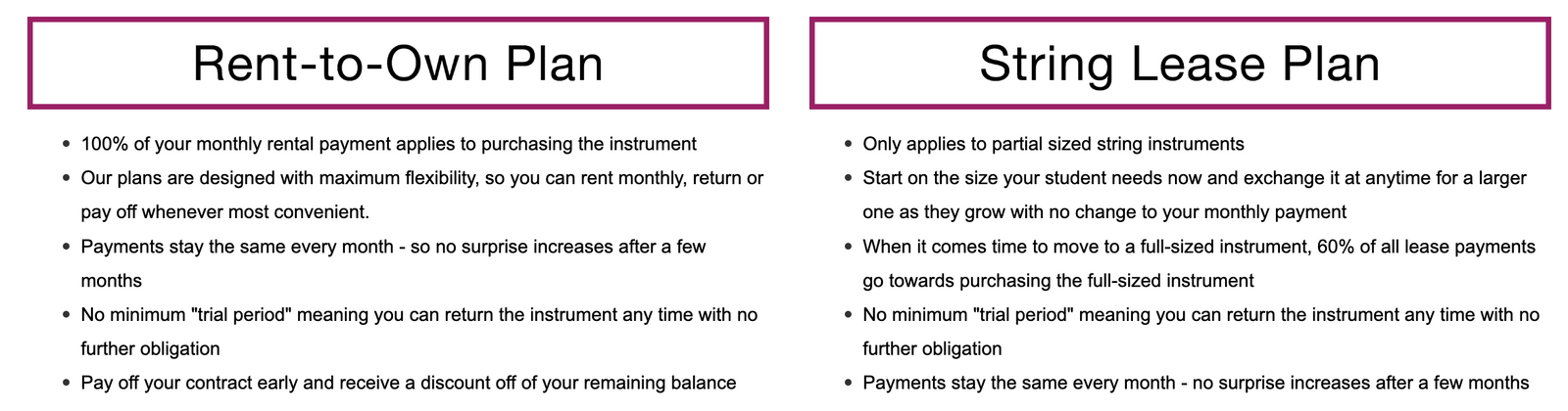 - When it comes time to move to a full-sized instrument, 60% of all lease payments go towards purchasing the full-sized instrument