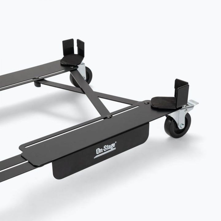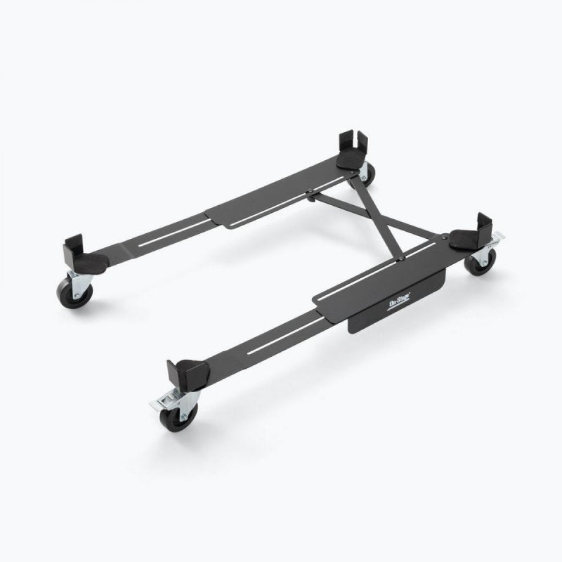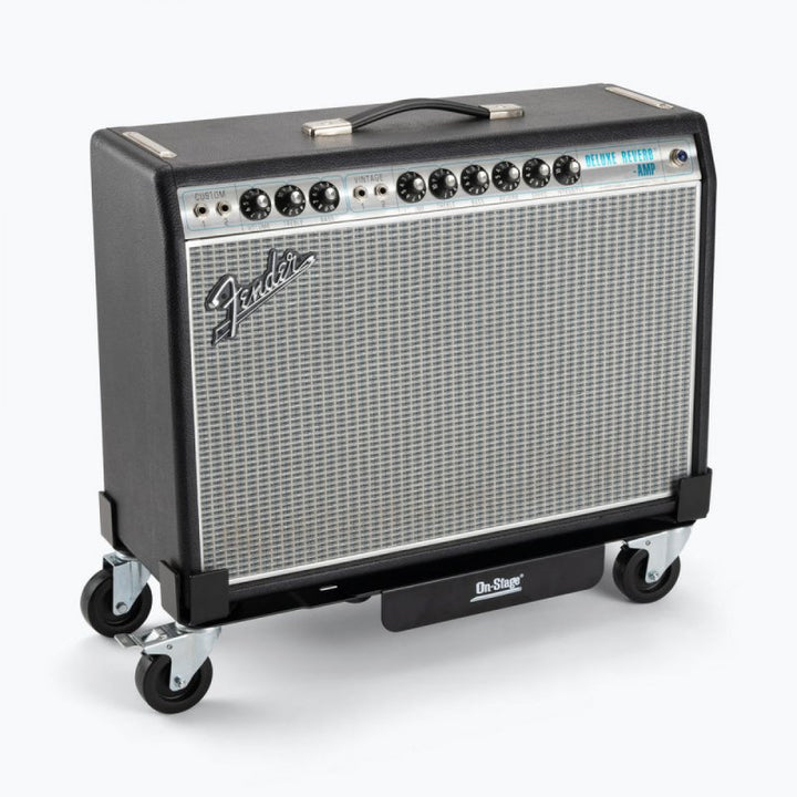 The AG5000 Amp Glider adds casters to your amp without the need for drilling holes or making modifications to the amp cabinet, giving your amp all the benefits of a rolling amp while maintaining the amp's collectibility and value. And whenever you want to return your amp to its original stationary state, it's as easy as loosening a few knobs. To enable a secure fit for a wide range of vintage and modern amps and speakers, the frame adjusts in length and width, securely clamping the corner brackets to the base of the cabinet. Four tightening knobs (two each for the length and width) lock in your size settings. Padding on the corner brackets provides traction that grips the amp, keeping the Amp Glider attached even when the amp is lifted-a major upgrade over an old-fashioned dolly or rolling cart. Additionally, the padding protects your amp's finish from dents and scratches. Swiveling casters roll smoothly and enable agile, unrestricted steering, making it easy to maneuver through streets, venues, and studios during load in, load out, and setup. Solid wheels that never go flat and steel caster rigs deliver dependable mobility. When the amp is parked for storage, practice, performance, or recording, locks on the casters keep it firmly and safely in place. The heavy-duty frame and cross braces are constructed of steel for strength and stability to ensure reliable support for your equipment. Yet the frame is also light in weight, maintaining the amp's ability to be lifted in situations where rolling is not possible, such as on stairs. Durably finished in classic black, the Amp Glider looks great, resists chips and scratches, and blends into your livestream, stage, or studio setup to add to a professional presentation. When not in use, the frame folds down for compact storage and efficient transportation.
