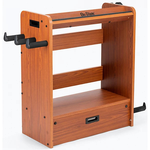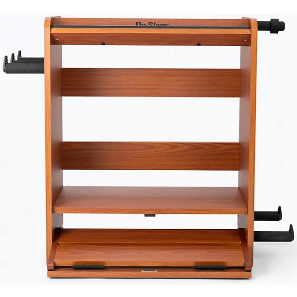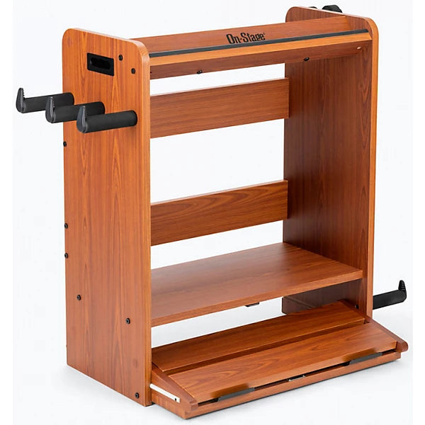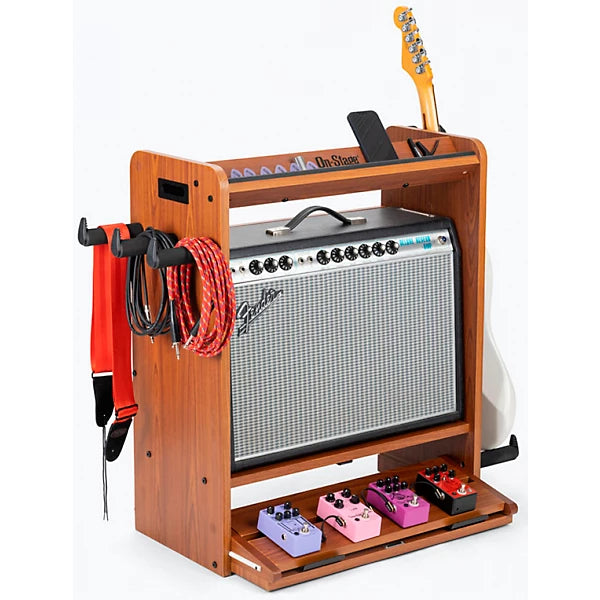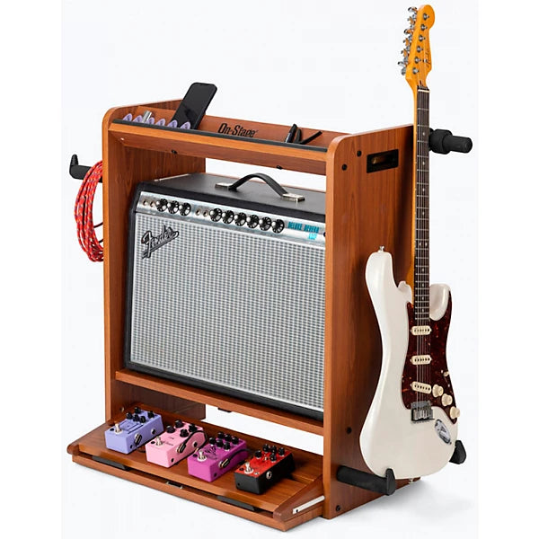 Meet the On-Stage GWS5000B guitar workstation–your go-to solution for an organized and protected guitar setup. This workstation combines an amp stand, guitar stand, pedalboard, and accessory station, streamlining your gear into one compact package.