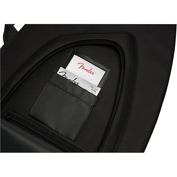 The Fender FEJ-610 gig bag is specially sized to fit your Jaguar, Jazzmaster or Starcaster guitar. The Fender 610 Series provides a stylish and affordable way to keep your electric guitar safe while traveling. Featuring the iconic asymmetrical shape of these legendary guitar models, the gig bag's durable outer layer is constructed of tough 600 Denier polyester that protects against impacts while avoiding ripping and tearing. The FEJ-610's interior is filled with 10mm padding and lined with soft touch microfiber to keep your instrument secure and prevent potential finish damage. The 610 gig bag also comes with a comfortable two-piece handle and ergonomic air mesh backpack straps with easily adjustable ladder lock buckles, so you can comfortably carry your instrument without unnecessary physical strain. Plus, the front storage pocket offers additional storage space for small accessories and a business card window.