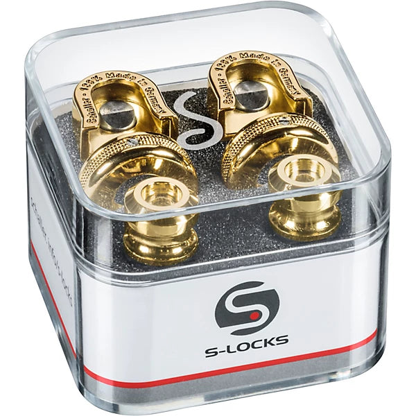 The Schaller S-Locks Gold, strap locks that revolutionize the connection between guitar and strap. Since 1981, Schaller has been setting the standard in strap locks and protecting beloved instruments with their unique designs. Now, Schaller proudly presents the new S-Locks Gold—'S' for save, silent and Schaller. These revolutionary strap locks are completely silent, featuring one-piece hardened steel strap buttons, an elegant lock wheel and a revamped pull-up ball for effortless locking and releasing. The S-Locks Gold provide maximum security against breakage for your guitar. The S-Locks Gold lets you shake, roll and play without noise.