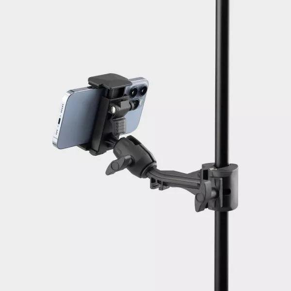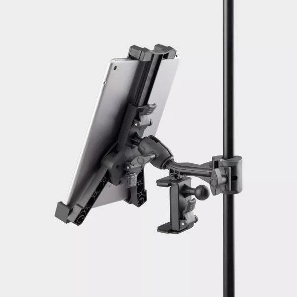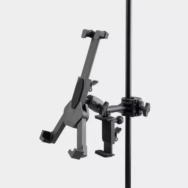 The TCM1500 Tablet/Smartphone Holder mounts to a mic stand or desktop and securely holds a tablets while simultaneously holding a smartphone or battery. Both holders adjust to fit tablets and phones of various sizes. Padding on the holders prevents slipping and protects your device from scratches. The versatile mount can screw directly onto the threaded end of a mic stand or boom, or it can use the included clamp to attach to shafts or desktops. A wide range of tilt and rotation facilitates positioning for ergonomic tablet viewing and operation.