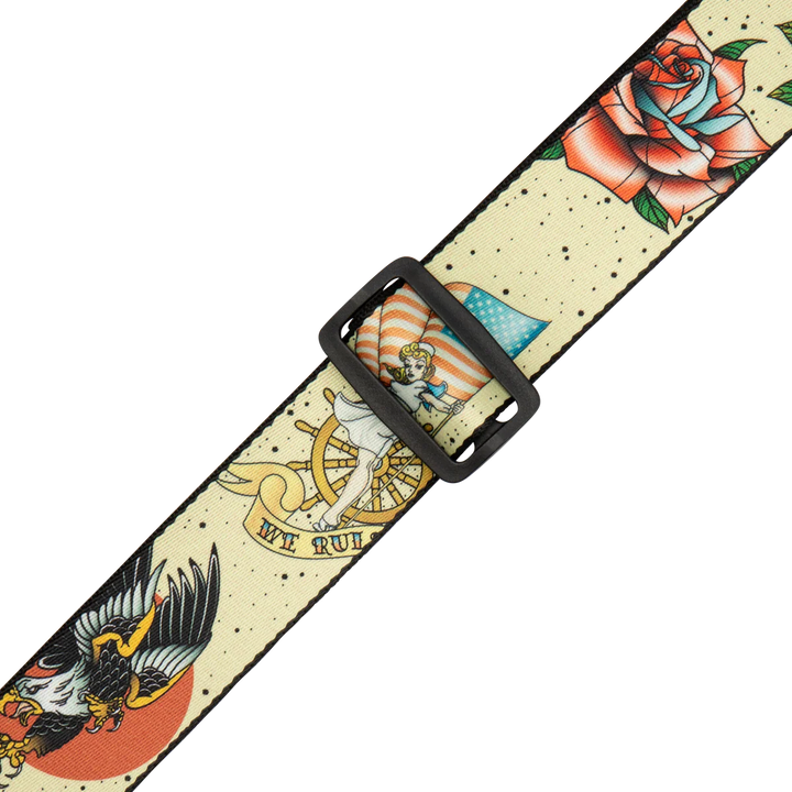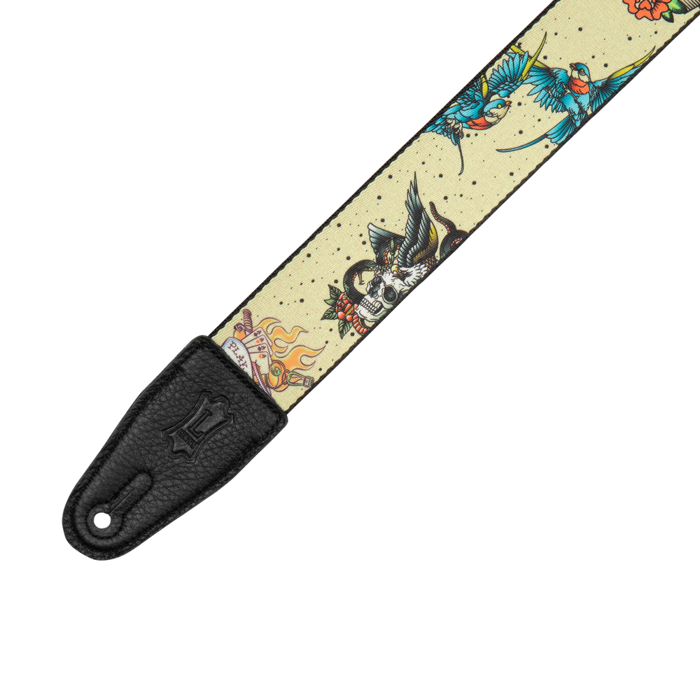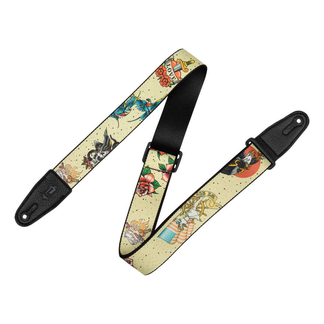 - One-ply printed polyester guitar strap with leather ends. Black plastic loop and slide hardware. Adjustable from 35" to 60".