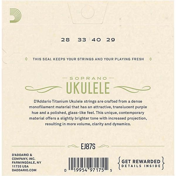 D'Addario EJ87S sets are designed for use with all soprano ukuleles. Each string within this set is made from D'Addario's bright sounding titanium material and optimized for GCEA tuning. D'Addario Titanium Ukulele strings are crafted from a dense monofilament material that has an attractive, translucent purple hue and a polished, smooth feel similar to nylon. This unique material is particularly beneficial to Ukuleles due to its slightly brighter tone and increased projection, resulting in more volume, clarity and dynamics.